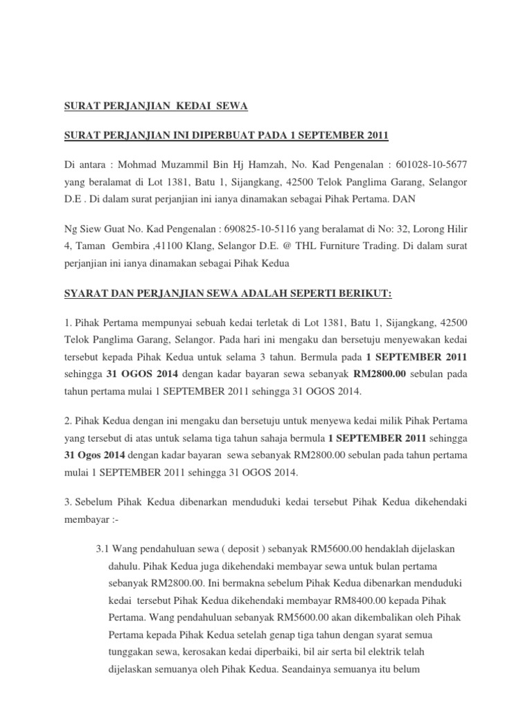 Surat perjanjian ini memang wajib ada karena memiliki tujuan supaya dari. Ketika dua orang atau 2 instansi melakukan kesepakatan biasanya diperlukan suatu jaminan untuk kepastian. Sebarang perubahan atau penambahan tentang perjanjian sewa rumah ini yang tidak disenaraikan dalam butiran perjanjian ini boleh dirujuk kepada. Pihak pertama adalah orang yang memiliki rumah kontrakan sewa dan pihak kedua merupakan calon penyewa rumah kontrak tersebut. Surat perjanjian sewa kedai 2020.