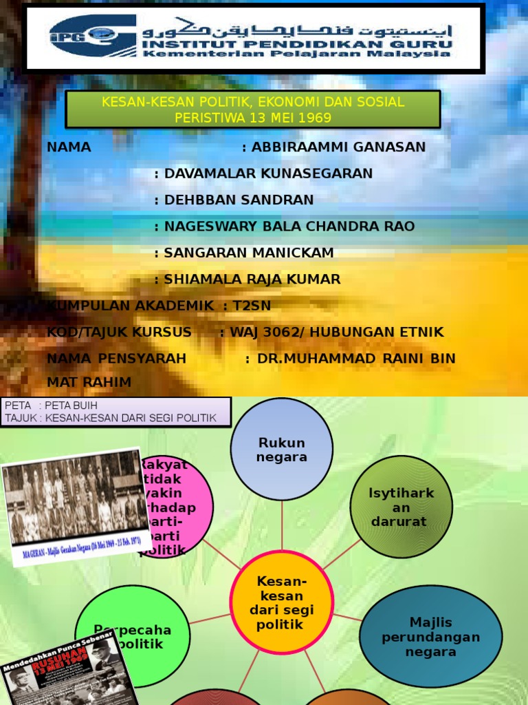 Tragedi ini telah meragut nyawa serta harta benda dan mempunyai kaitan yang rapat dengan pilihan raya umum 10 mei 1969 merupakan satu titik hitam dalam sejarah negara. 1.0 pengenalan peristiwa 13 mei 1969 merupakan satu tragedi berdarah yang banyak meninggalkan kesan terhadap politik , ekonomi dan sosial masyarakat malaysia. Download ppt kesan daripada peristiwa 13 mei 1969. Peristiwa 13 mei pada tahun 1969 ialah insiden rusuhan kaum yang berlaku dan kemuncak masalah perpaduan di malaysia. Download & view kesan peristiwa 13 mei 1969 as pdf for free. 14 dr mahathir pencetus wawasan 2020. 13 mei 1969 tidak akan berulang lagi kerana membahayakan keamanan, negara dan perpaduan masyarakat malaysia. Antaranya ialah tentang isu politik, ekonomi, pendidikan dan sosial kaum. Politik zaman inggeris telah menyebabkan hak kekuasaan raja serta sultan melayu dihadkan dan hanya menjadi lambing kepada sesebuah negeri/negara. 15 9 cabaran wawasan 2020 membina bangsa malaysia yang bersatu padu. Kesan dari tragedi itu ramai nyawa yang tak berdosa terkorban telah dan harta benda juga turut musnah. Download & view kesan peristiwa 13 mei 1969 as pdf for free. Pengenalan :::peristiwa 13 mei 1969 merupakan satu tragedi berdarah yang banyak meninggalkan kesan terhadap politik , ekonomi dan sosial masyarakat malaysia.