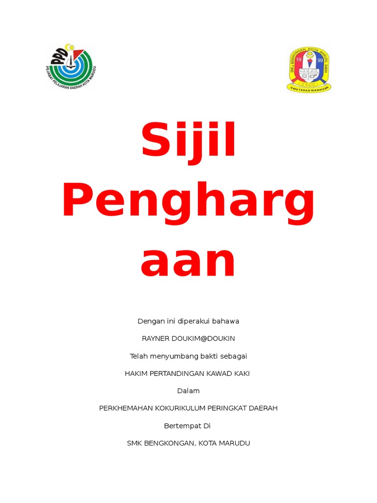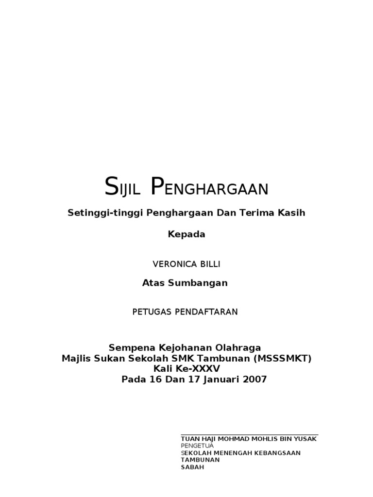 You can create one as well, really easily.get started. Contextual translation of contoh sijil penghargaan into english. Kebanyakan sijil penghargaan berukuran 8.5 x 11 inci, saiz sekeping kertas standard. Use the download button below or simple online reader. Sijil penghargaan setinggi penghargaan dan sekalung tahniah kepada wan nur nabihah binti wan anuar 951231114733 dalam kejayaan beliau dalam pertandingan debat peringkat sekolah anjuran persatuan bahasa melayu tandatangan pengetua muskamaljonan.