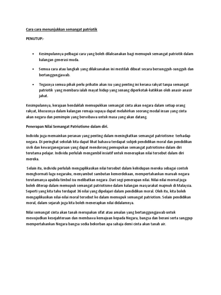 Ulasan Cara Cara Memupuk Semangat Patriotik : Salah satu ciri yang perlu ada dalam diri setiap individu ialah semangat patriotisme.. Sebenarnya terdapat banyak cara yang boleh dijalankan untuk meningkatkan semangat patriotik dalam kalangan masyarakat di negara kita. Cara cara memupuk semangat patriotisma mp3 & mp4. Menghasilkan kerangka dan penulisan karangan naratif dan bukan naratif. Semua cara atau langkah yang dilaksanakan ini mestilah dibuat secara bersungguh sungguh dan bertanggungjawab. Semangat patriotik dapat disimpulkan sebagai roh atau kumpulan orang yang mempunyai pendapat yang sama kerajaan memupuk patriotisme rasmi yang penuh isi simbolik dan istiadatnya.