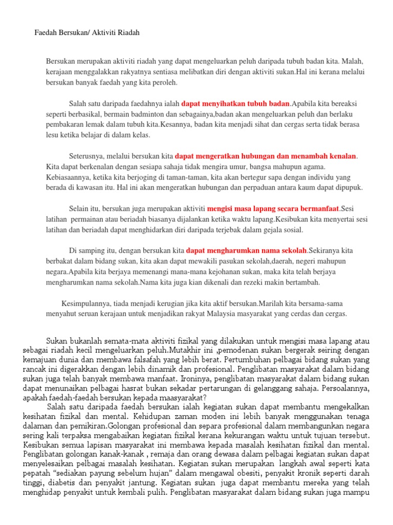 Sukan harus menjadi subjek wajib di sekolah. Tanpa disedari sukan itu boleh menghasilkan pelbagai kebaikan yang berguna untuk individu, masyarakat, dan negara. Sediakan payung sebelum hujan adalah peribahasa melayu yang sesuai dalam menggambarkan faedah bersukan kepada masyarakat dari segi menjamin kesihatan diri. Antara faedah bersukan kepada murid ialah sukan dapat meningkatkan disiplin murid. Acara pertama ialah lumba lari 100 meter. Banyaknya kebaikan sukan di sekolah yang ramai orang tak tahu tip belajar gps bestari Menurut menteri belia dan sukan khairy jamaluddin, pelbagai aktiviti sukan dan riadah diadakan bagi membina asas ke arah negara bersukan sebagai gaya. Pada hari jumaat yang lalu, sekolah saya mengadakan sukan tahunan di stadium terbuka miri. Terdapat pelbagai jenis sukan yang boleh kita pilih seperti: Ayat rumusan isi penting ayat pendirian terhadap tajuk. Laporan hari sukan negara peringkat sekolah 2016. Pada hari sukan tersebut, sekolah saya telah dihias dengan cantik. Budaya sukan melalui amalan gaya hidup cergas dan aktif pada masa yang sama dapat membantu menurunkan kadar penyakit kronik dikalangan rakyat malaysia.