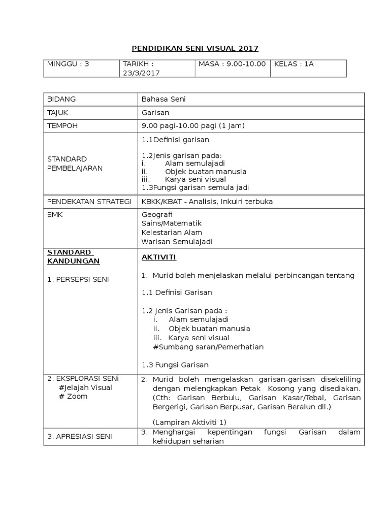 Rph Psv F3i Docx Rancangan Pengajaran Harian Minggu 14 Tarikh Hari Masa Matapelajaran Tingkatan Kehadiran Kehadiran Bidang Tajuk Sub Tajuk Objektif Course Hero from www.coursehero.com Kesan pergerakan yang wujud daripada pengulangan visual. Rancangan pengajaran tahunan pendidikan kesenian tahun 1 2021 minggu bidang tema tajuk pembelajaran standard kandungan standard pembelajaran catatan 1 menggambar tema :alam benda tajuk :rumah aktiviti :lukisan 1. Kami di sini hanyalah bertugas sebagai pengumpula bahan. Rph pendidikan jasmani kesihatan tingkatan 1 2021, rph pendidikan seni visual tingkatan 1 2021, rph sejarah tingkatan 1 2021, rph sains tingkatan 1 2021, rph re use this promo code rphpromo10 at checkout to get myr 10.00 off with minimum purchase myr 100.00. Rph pendidikan jasmani kesihatan tingkatan 1 2021, rph pendidikan seni visual tingkatan 1 2021, rph sejarah tingkatan 1 2021, rph sains tingkatan 1 2021, rph re use this promo code rphpromo10 at checkout to get myr 10.00 off with minimum purchase myr 100.00. Rph kssm psv t2 1. Contoh rancangan mengajar harian (rph) psv tingkatan 1 2017. Perkembangan seni visual di malaysia.