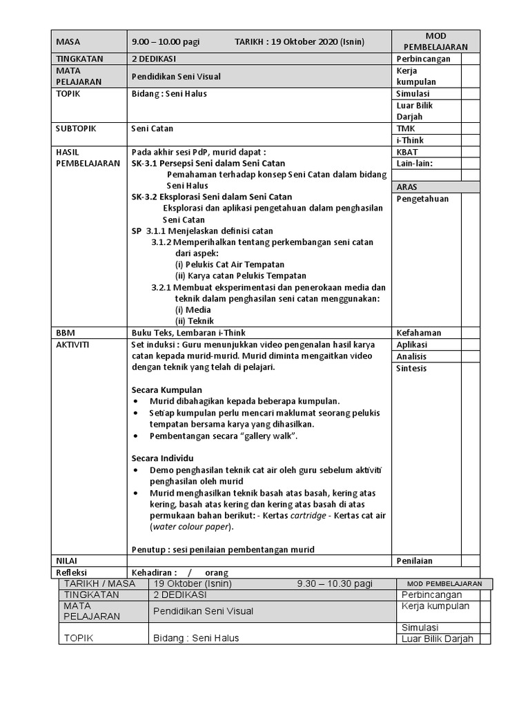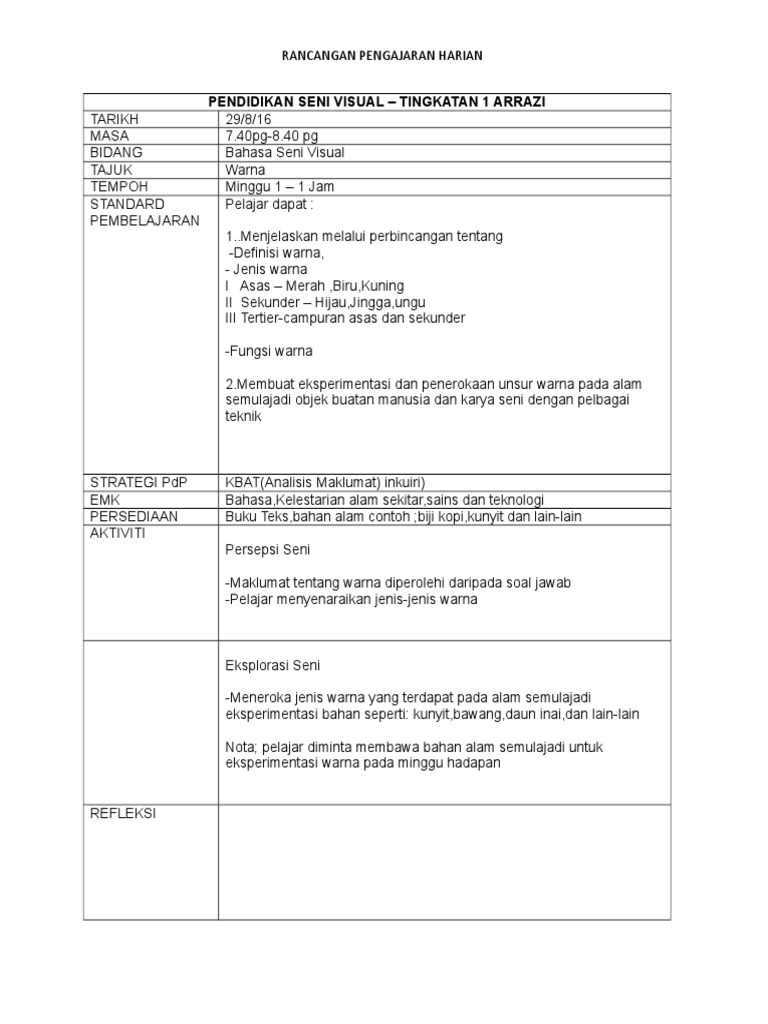 Menjelaskan melalui perbincangan tentang definisi, jenis dan fungsi rupa 2. Penyediaan rph dalam kalangan guru dapat mengelakkan penyelewengan atau. Rancangan pengajaran harian pendidikan seni visual bil perkara. Kesan pergerakan yang wujud daripada pengulangan visual. Penyusunan sub topik daripada mudah ke sukar membolehkan murid menguasai pengetahuan dan kemahiran yang disampaikan dengan mudah dan jelas.